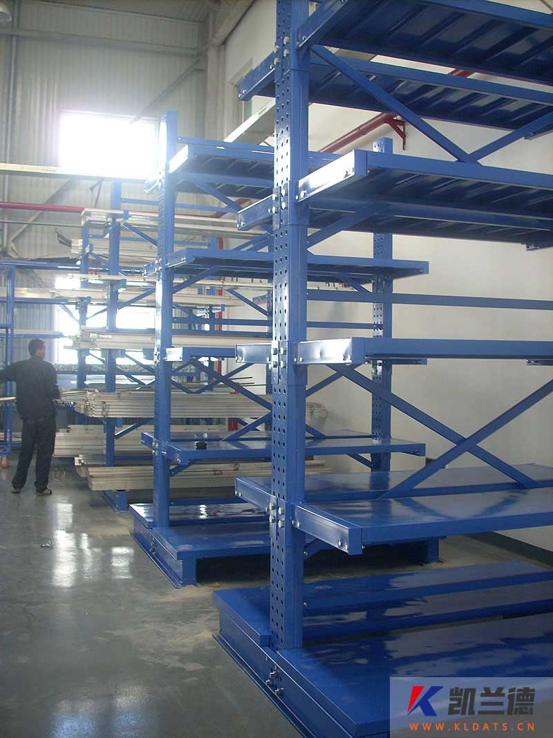 懸臂式貨架適用于存放長物料、環型物料、板材、管材及不規則貨物。懸臂式貨架立柱多采用H型鋼或冷軋型鋼,懸臂采用方管、懸臂貨架使用冷軋型鋼或H型鋼,懸臂與立柱間采用插接式或螺栓連接式,底座與立柱間采用螺栓連接式,底座采用冷軋型鋼或H型鋼。貨物存取由叉車、行車或人工進行。貨架高度通常在2.5米以內(如由叉車存取貨則可高達6米),懸臂長度在1.5米以內,每臂載重通常在1000KG以內。此類貨架多用于機械制造行業和建材超市等。加了擱板后,特別適合空間小,高度低的庫房,管理方便,視野寬闊,與普通擱板式貨架相比,利用率更高;根據承載能力可分為輕量型、中量型、重量型三種。