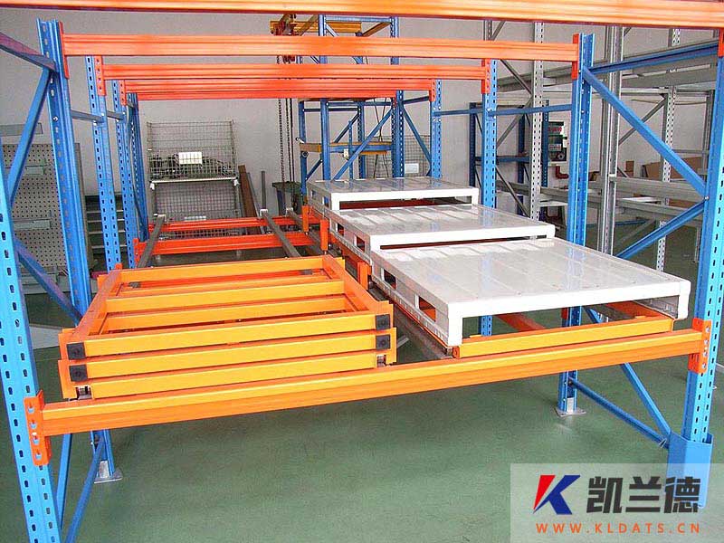 壓入式貨架又名后推式貨架——是在前后梁間以多層臺車重疊相接,從外側將疊棧貨物置于臺車推入,后儲存之貨品會將原先貨品推往里面。壓入式貨架是由托盤小車等典型結構件組成,托盤車具有可流動特性,貨物被規定于貨架的一端進出,并遵循先進后出順序。儲運貨物時叉車只位于貨架通道水平較低的一端作業,無需進入貨架貨物存儲通道。此類貨架具有存儲密度高,儲運速度快的典型特征。通常用于存儲場地極其有限,但需要增加存儲容量或對貨物有時間要求等對貨物揀選要求不高的場合使用。壓入式的優點就是節約作業通道數量,對叉車要求不高,可以有效提高利用率,主要應用在倉庫空間不足,而且倉庫的面積又不大的地方;而且貨品要符合可以先進后出的位置。