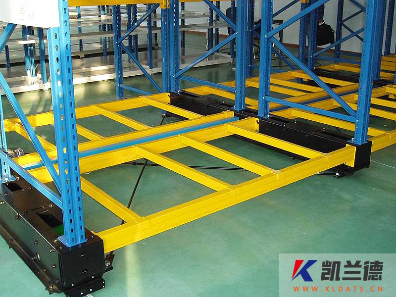 兩排背靠背貨架成一組安裝在一個移動底盤上,呈多組排列,每個底盤附設多個滾輪和驅動電機,通過按動控制按鈕,由驅動電機通過鏈條傳動帶動整個底盤及其上貨架貨物,沿鋪于地面上的兩條或多條軌道移動(或無軌—磁條異引),從而叉車可進入已移動開的場地進行存取貨。