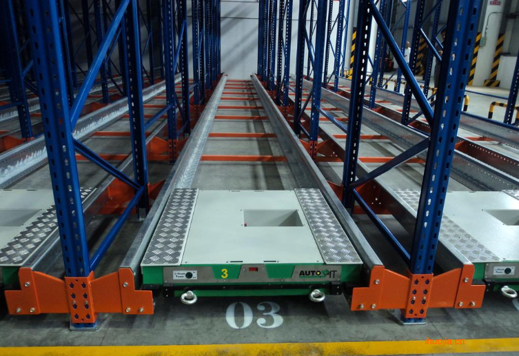 結構特點:主要由貨架部分、穿梭車及叉車三個部分構成。穿梭車可以自行將托盤提升并沿著貨架巷道內的軌道運行,將貨物從入口處運送到巷道里面或者從巷道里面運送到出口處。